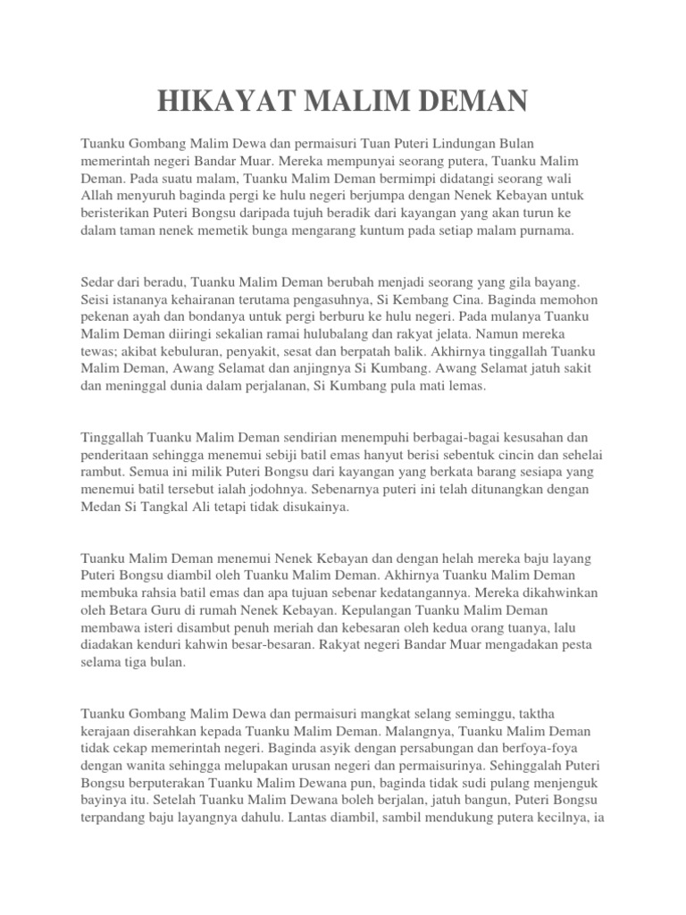Terdapat juga Glosari disediakan pada bahagian akhir buku kerana beberapa perkataan arkaik akan diberikan makna. No photo no image is available for the time being. Buku Hikayat Malim Dewa Librarika Hikayat Malim Deman Adakah tuanku malim deman berjaya mendapatkan permaisuri dan puteranya yang berada di kayangan dan kembali ke dunia.
